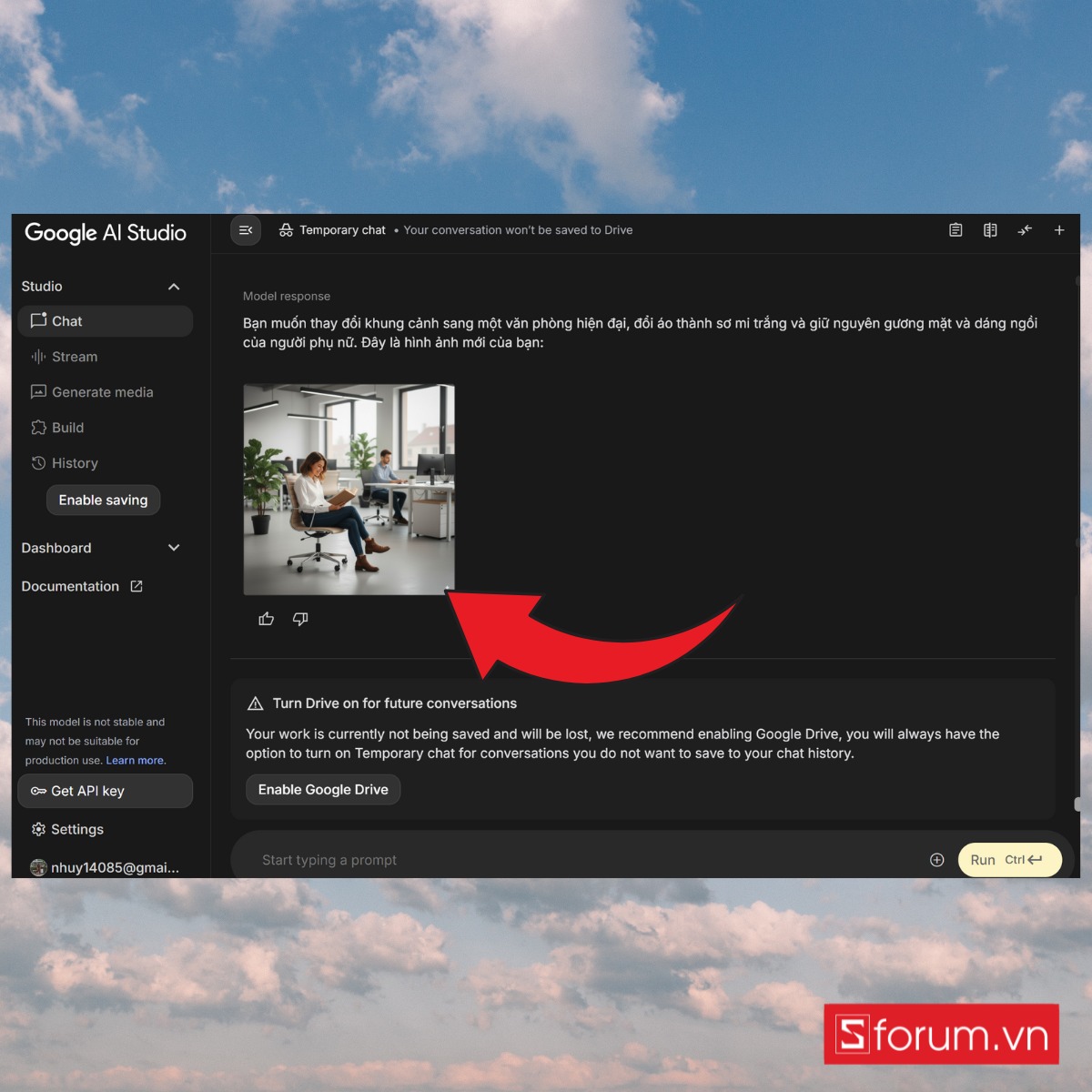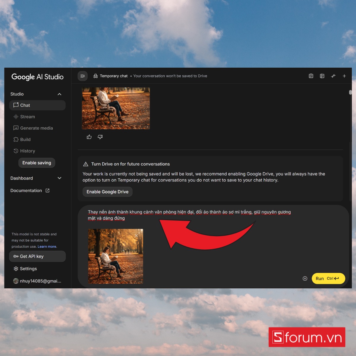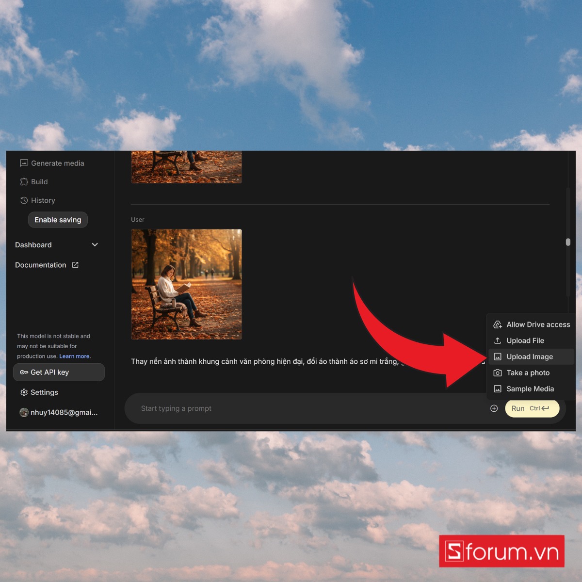 Nhập mô tả yêu cầu chỉnh sửa, chẳng hạn: “Thay nền ảnh thành khung cảnh văn phòng hiện đại, đổi áo thành áo sơ mi trắng, giữ nguyên gương mặt và dáng đứng”.