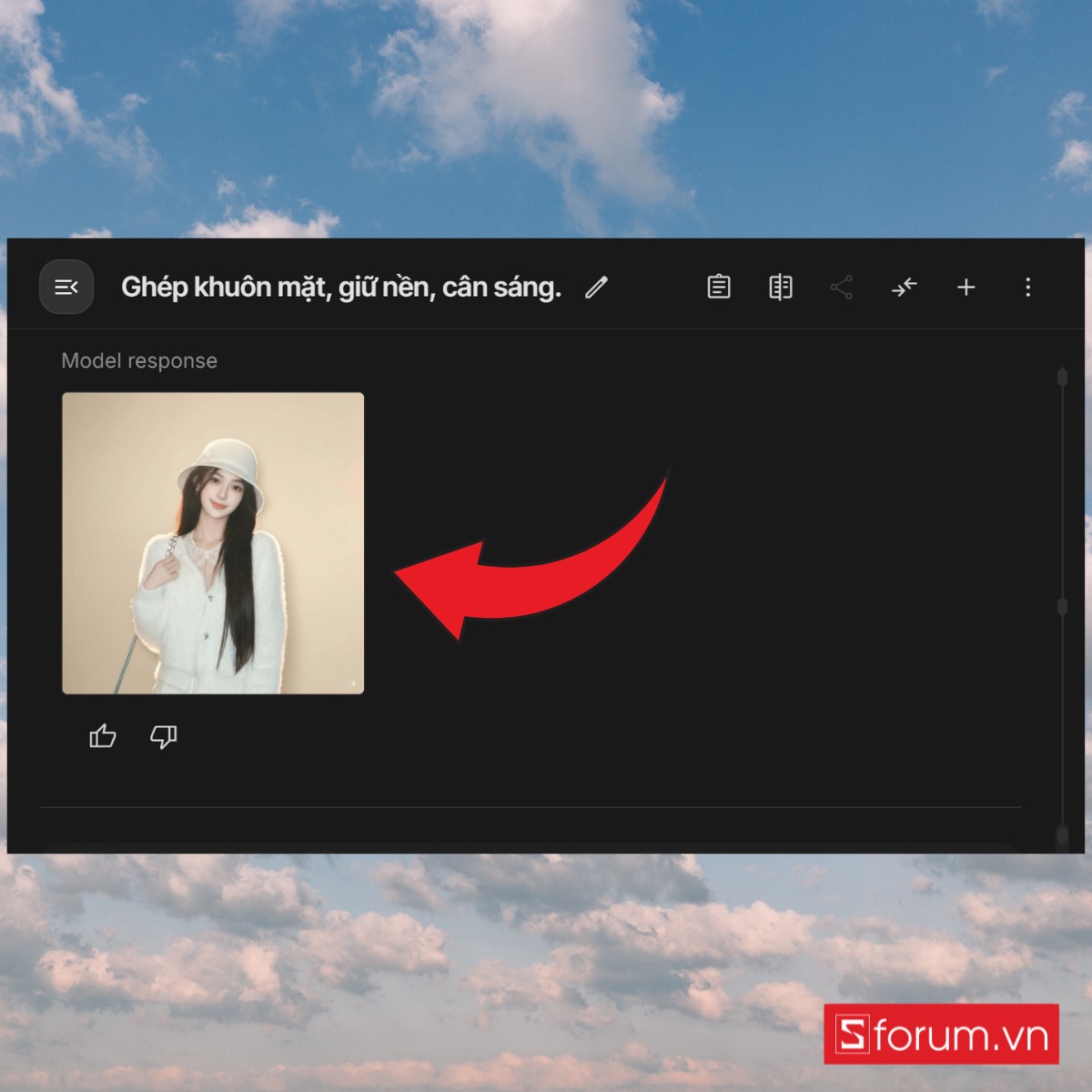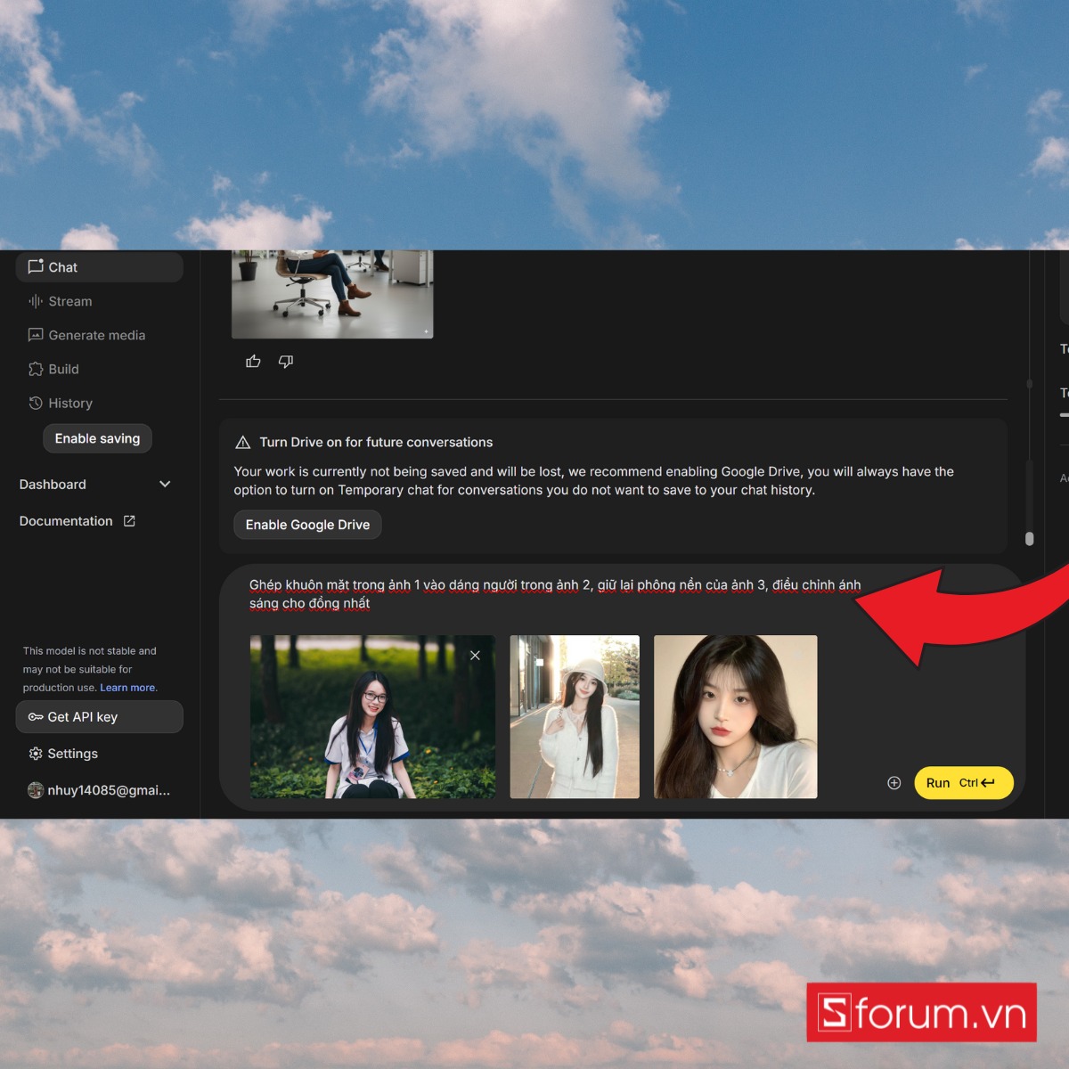 Nhập prompt chỉ định rõ: “Ghép khuôn mặt trong ảnh 1 vào dáng người trong ảnh 2, giữ lại phông nền của ảnh 3, điều chỉnh ánh sáng cho đồng nhất”.
