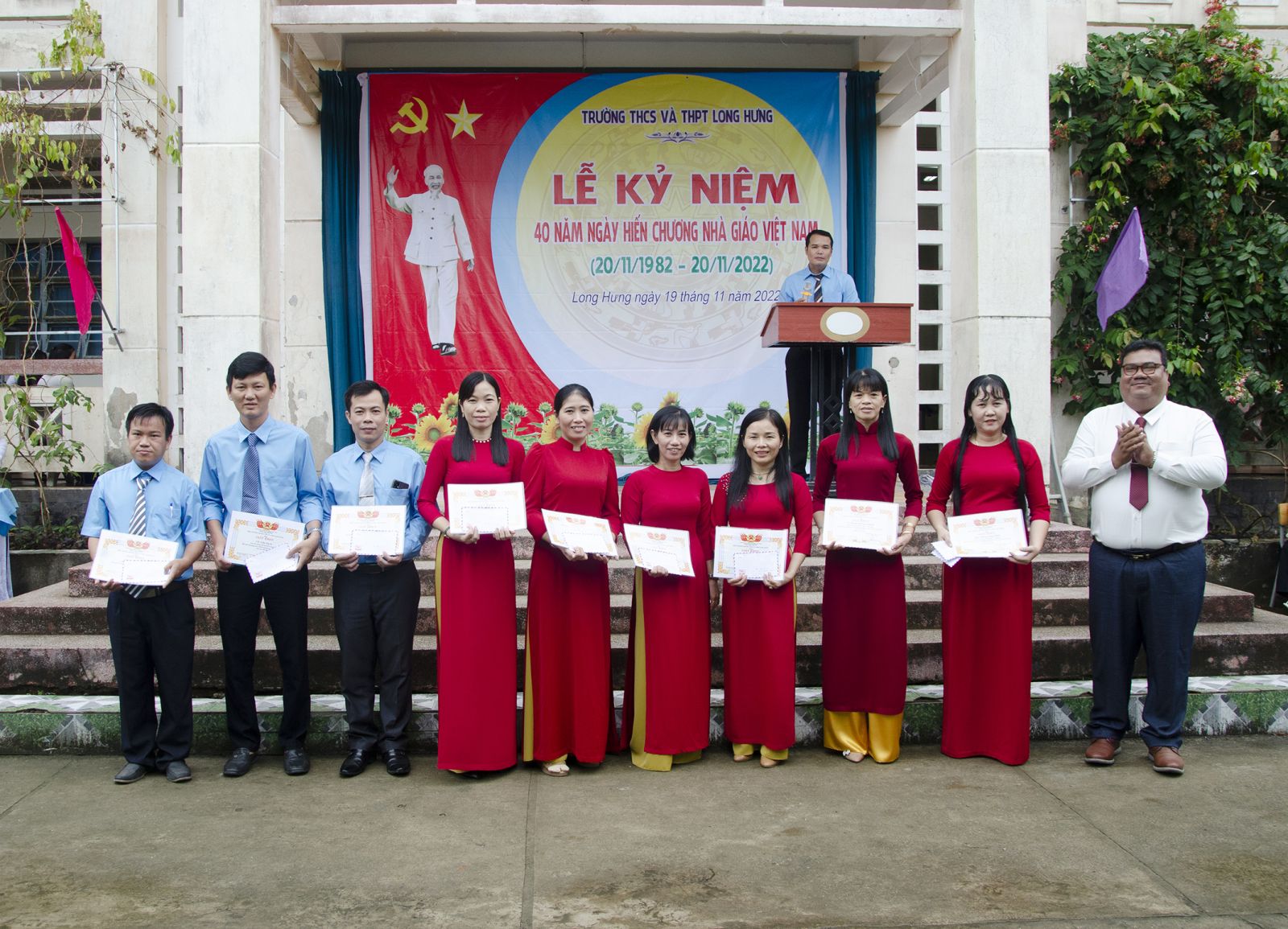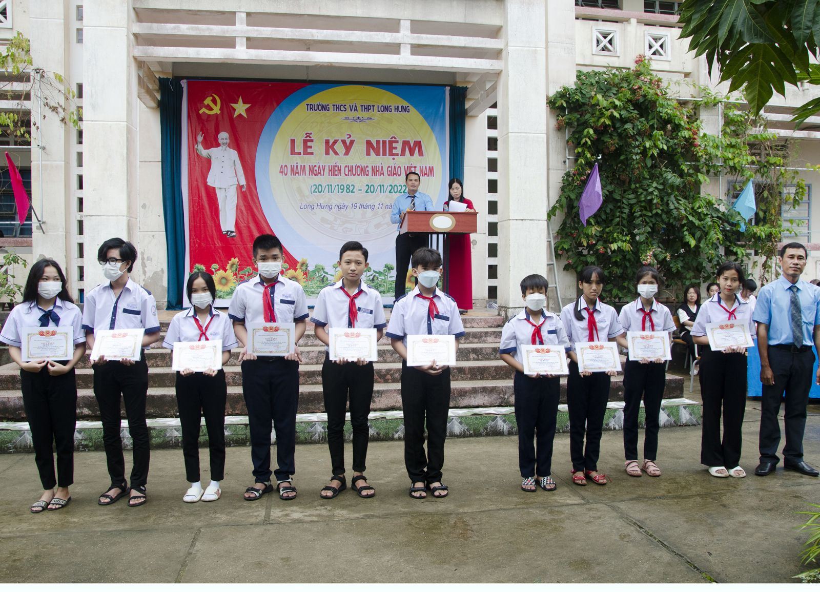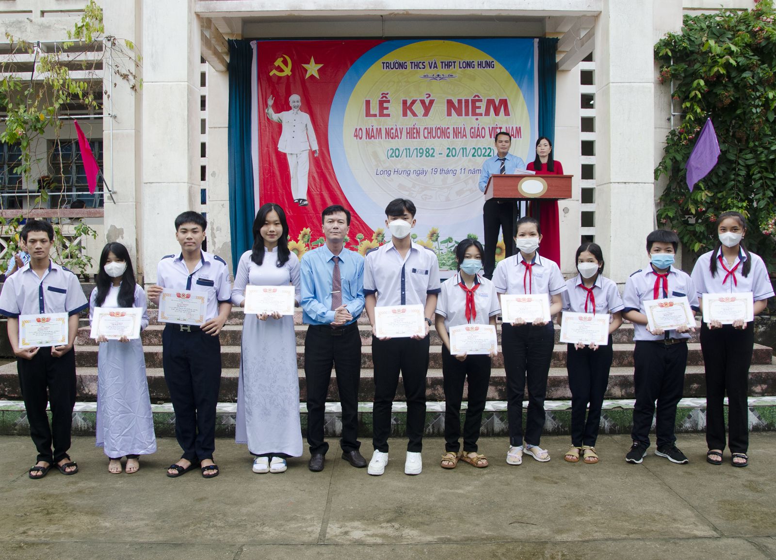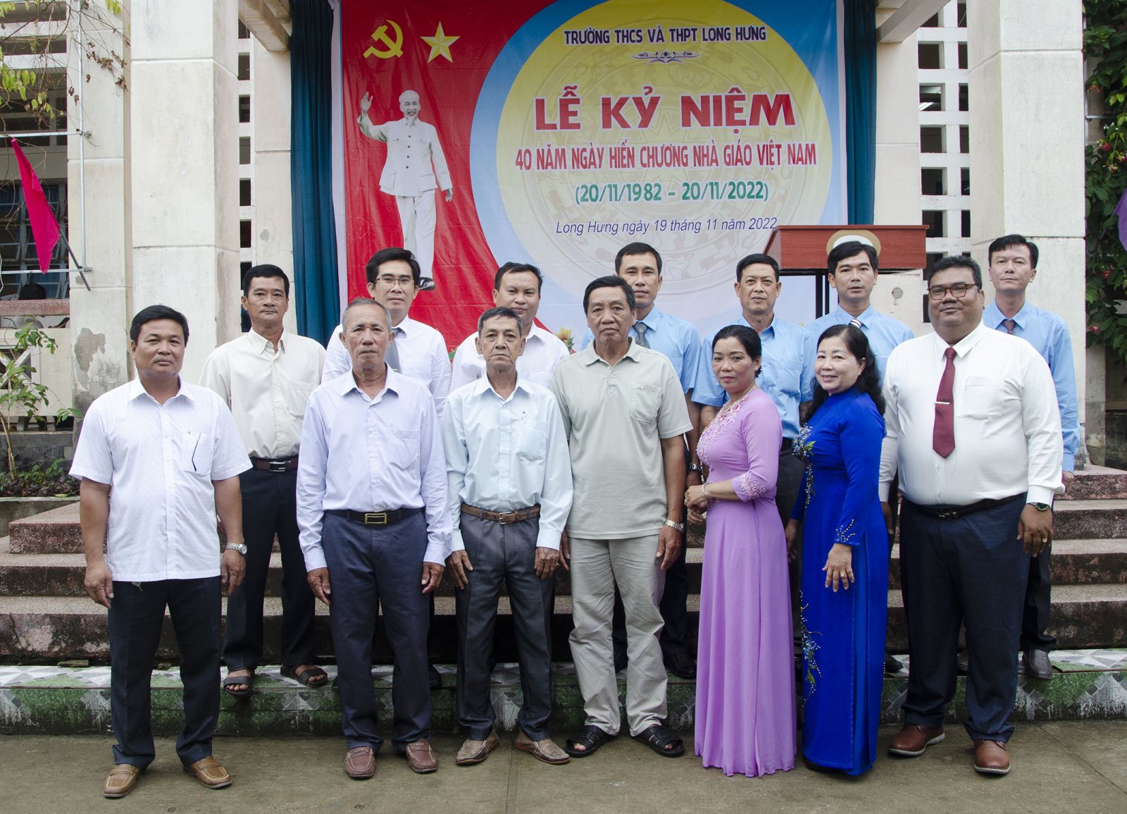 Vào lúc 7 giờ 15, ngày 19/11/2022 (Thứ 7) tại Sân trường THCS và THPT Long Hưng, ấp Mỹ Khánh A tổ chức buổi họp mặt chào mừng kỷ niệm 40 năm ngày Nhà giáo Việt Nam nhằm giáo dục truyền thống “Tôn sư trọng đạo – Uống nước nhớ nguồn” và tôn vinh nghề dạy học. Đồng thời, ôn lại truyền thống tốt đẹp của nhà giáo Việt Nam, những người đã có công trong sự nghiệp giáo dục địa phương cũng như cả nước;