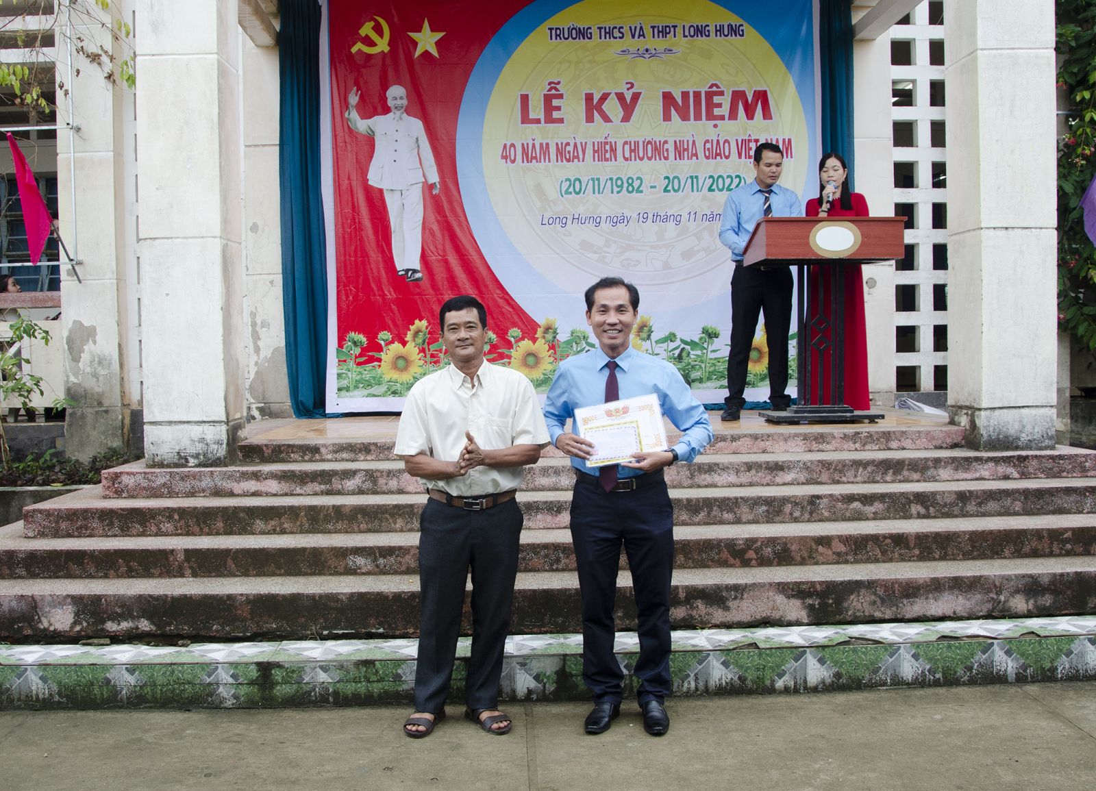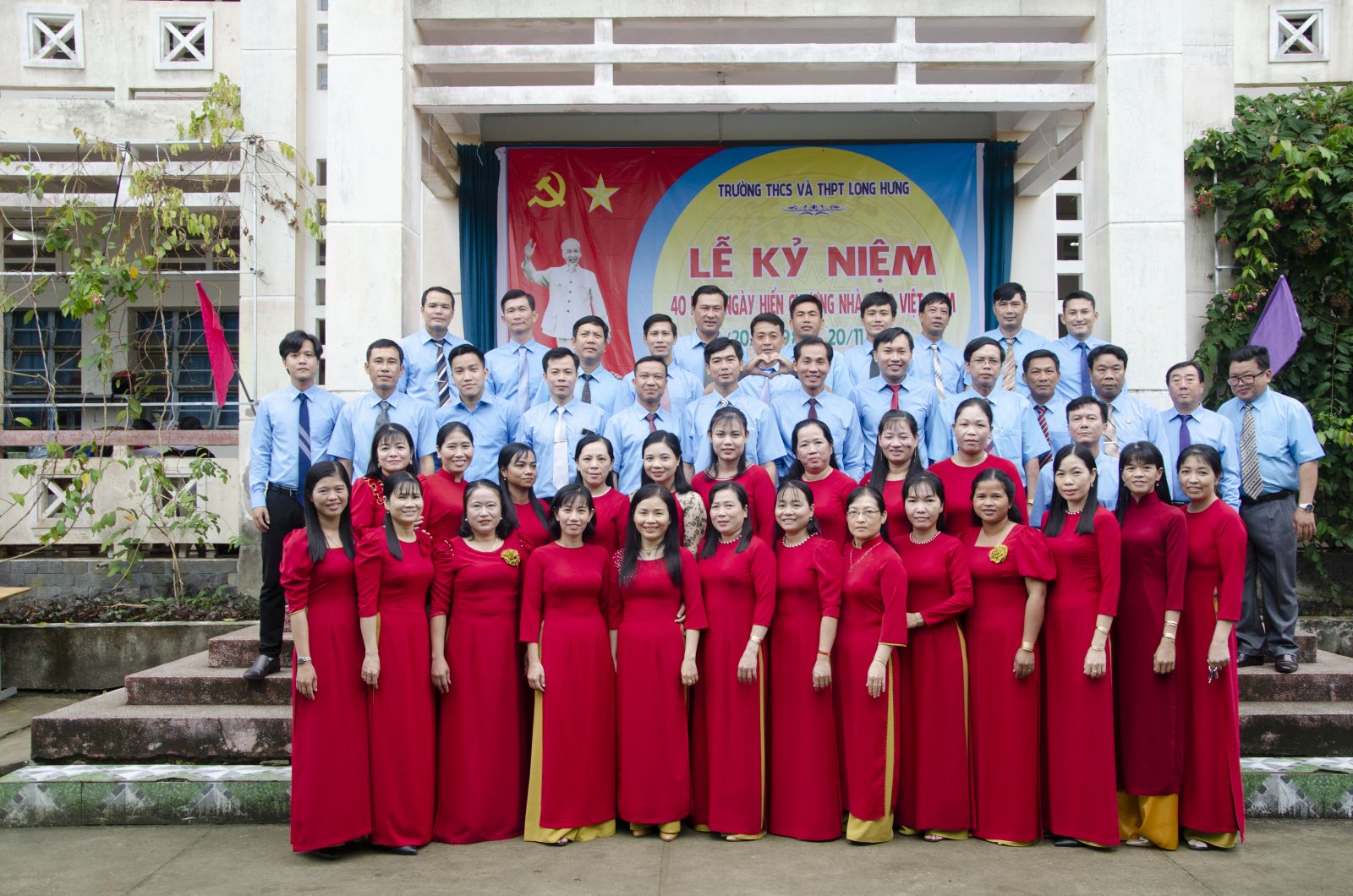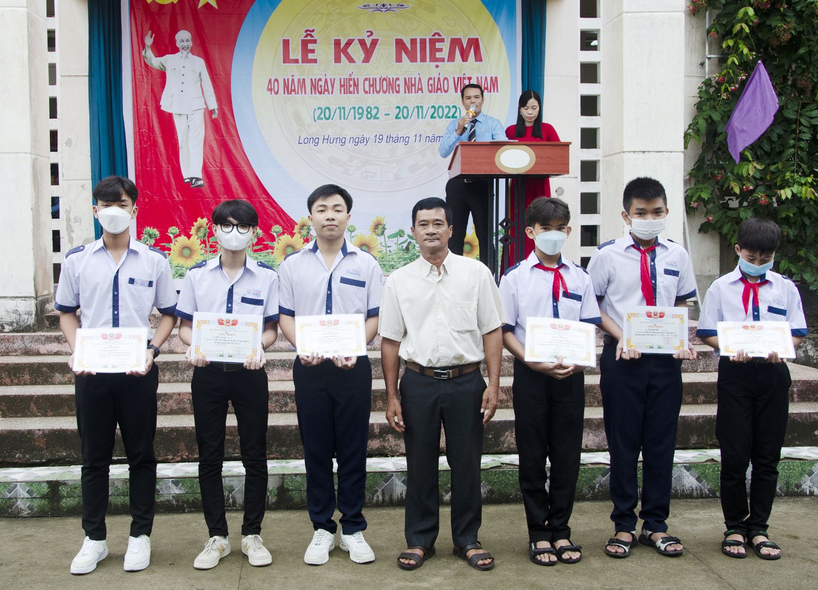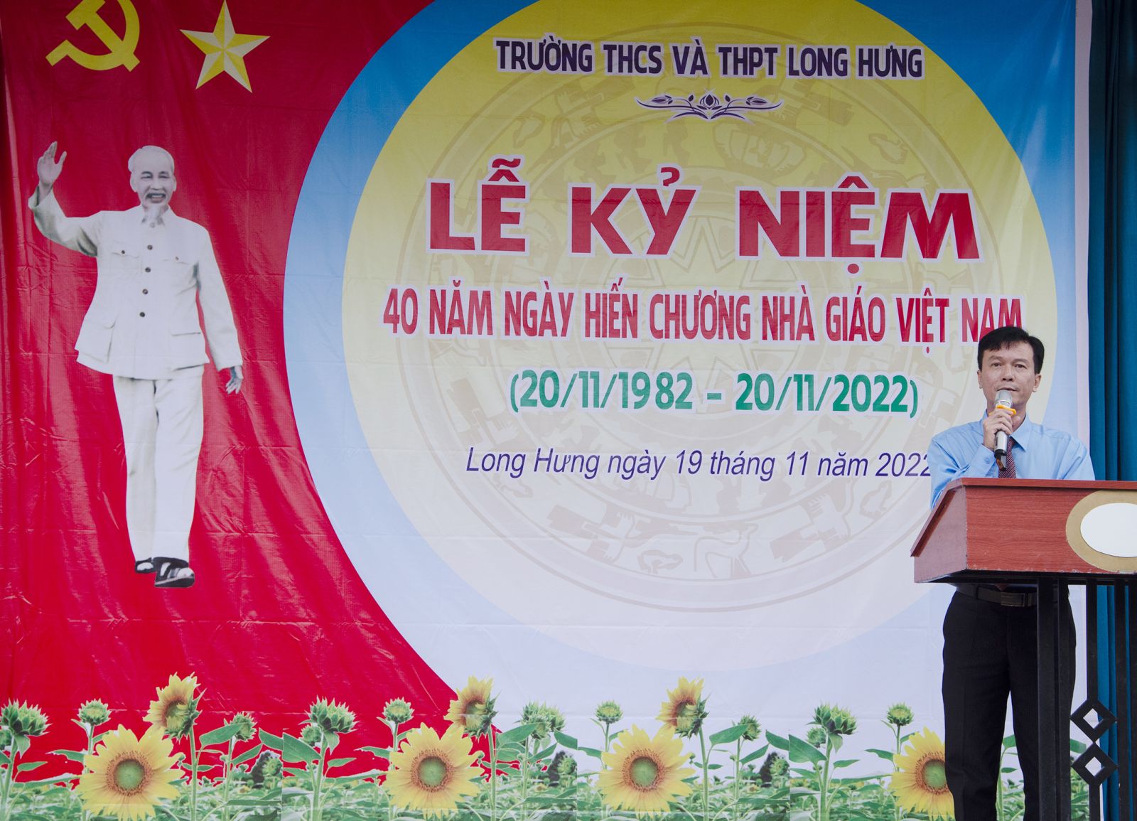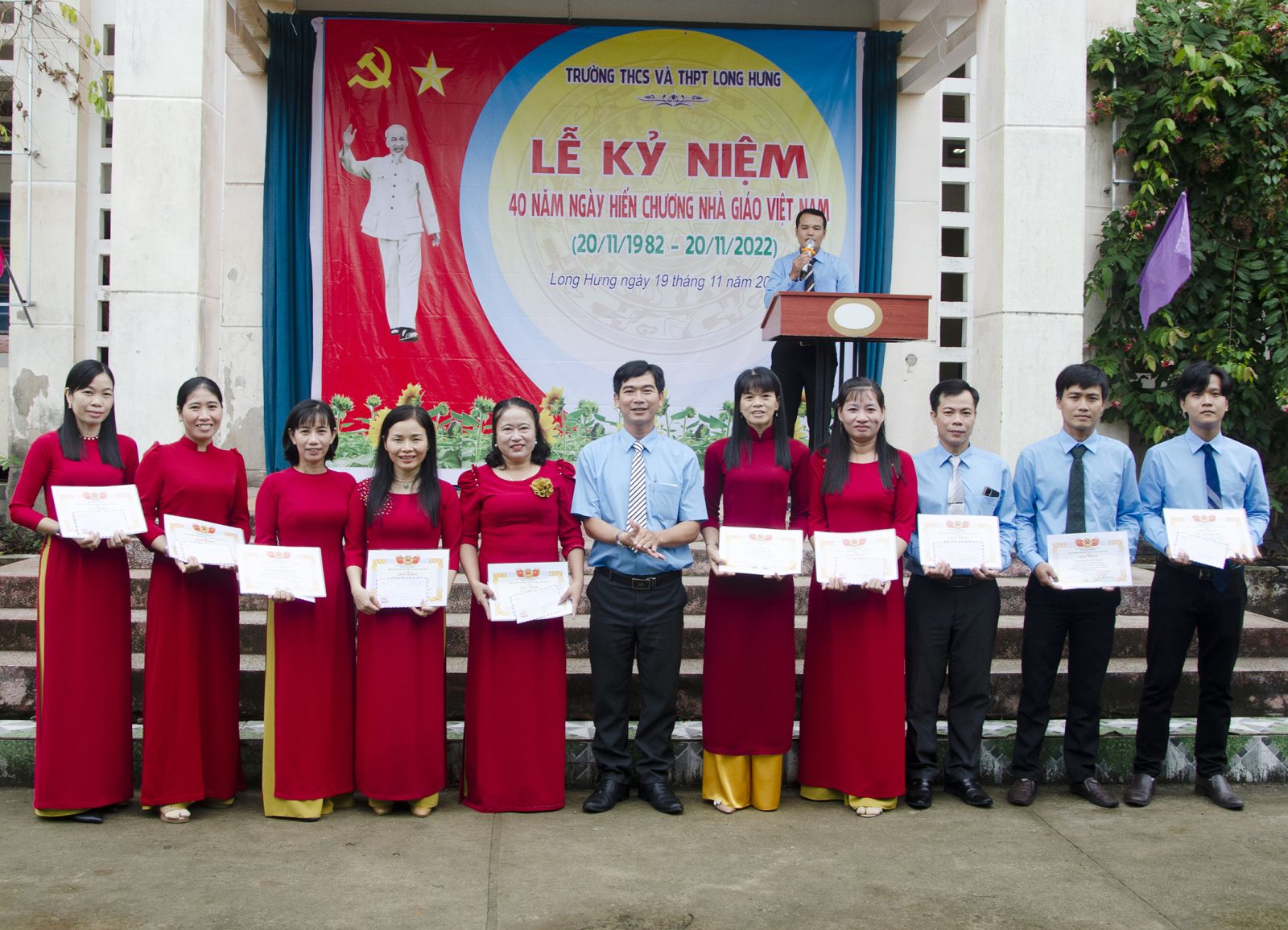 Vào lúc 7 giờ 15, ngày 19/11/2022 (Thứ 7) tại Sân trường THCS và THPT Long Hưng, ấp Mỹ Khánh A tổ chức buổi họp mặt chào mừng kỷ niệm 40 năm ngày Nhà giáo Việt Nam nhằm giáo dục truyền thống “Tôn sư trọng đạo – Uống nước nhớ nguồn” và tôn vinh nghề dạy học. Đồng thời, ôn lại truyền thống tốt đẹp của nhà giáo Việt Nam, những người đã có công trong sự nghiệp giáo dục địa phương cũng như cả nước;
