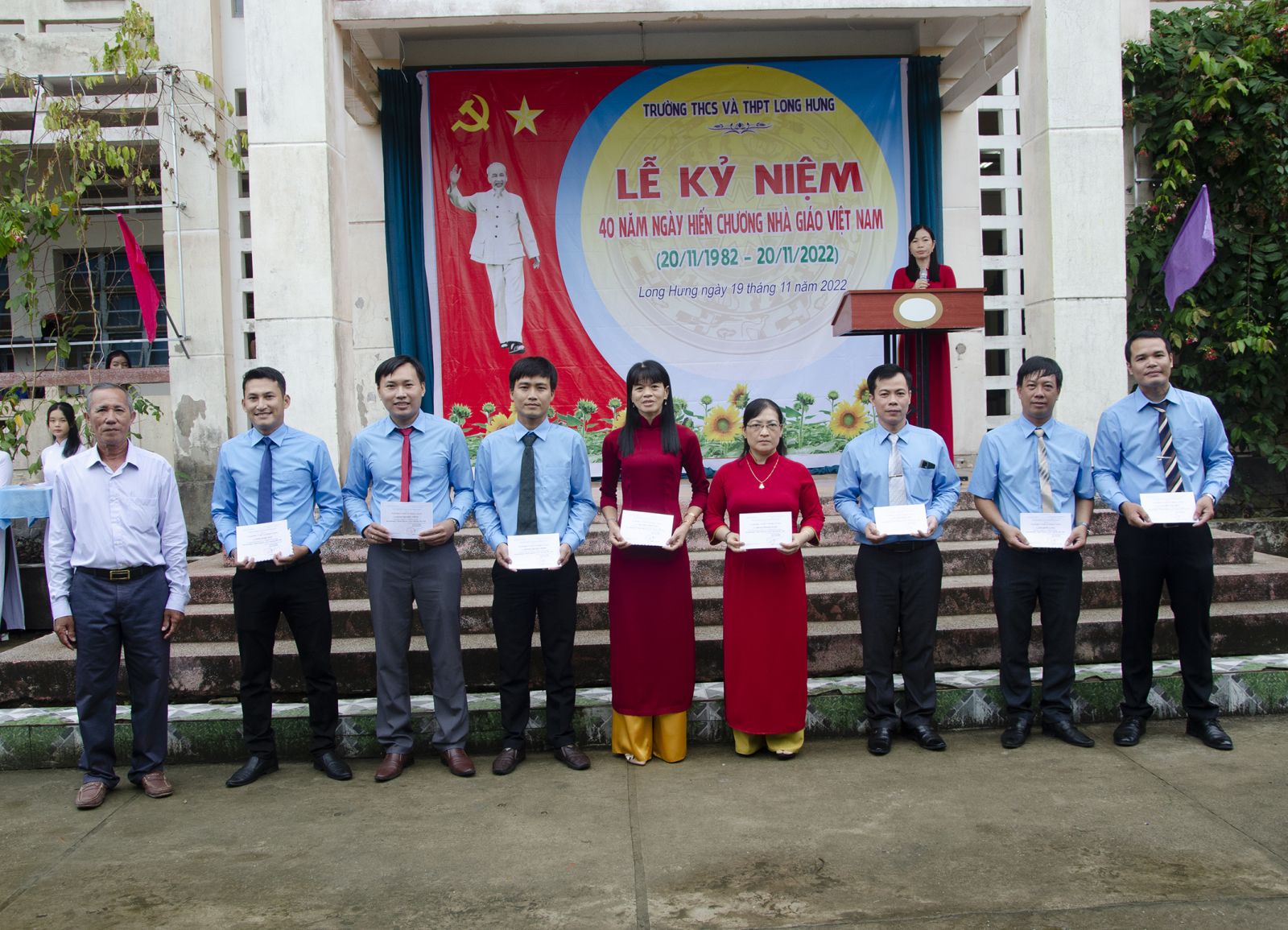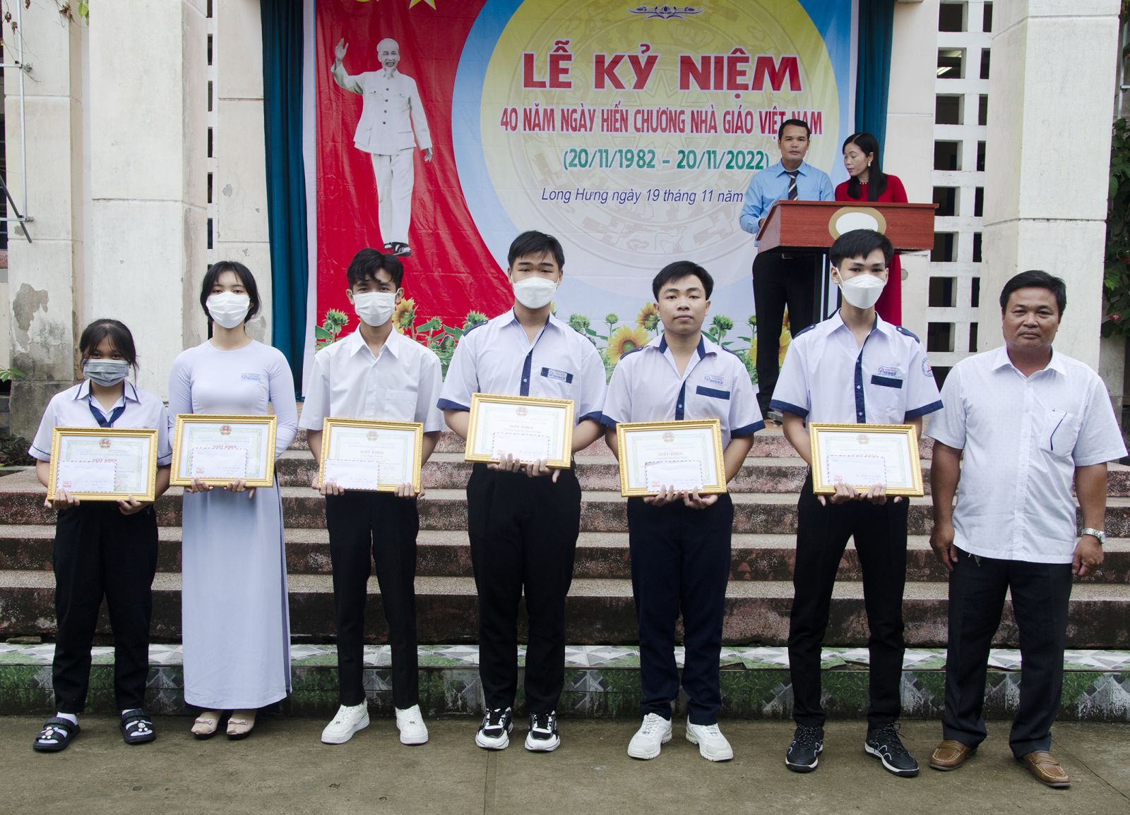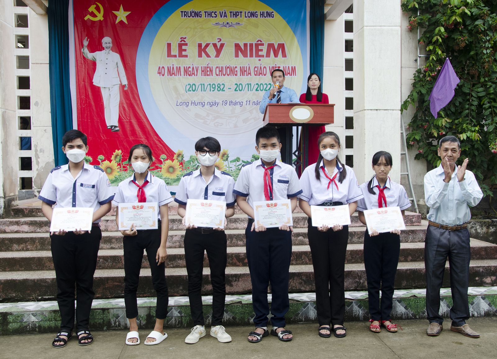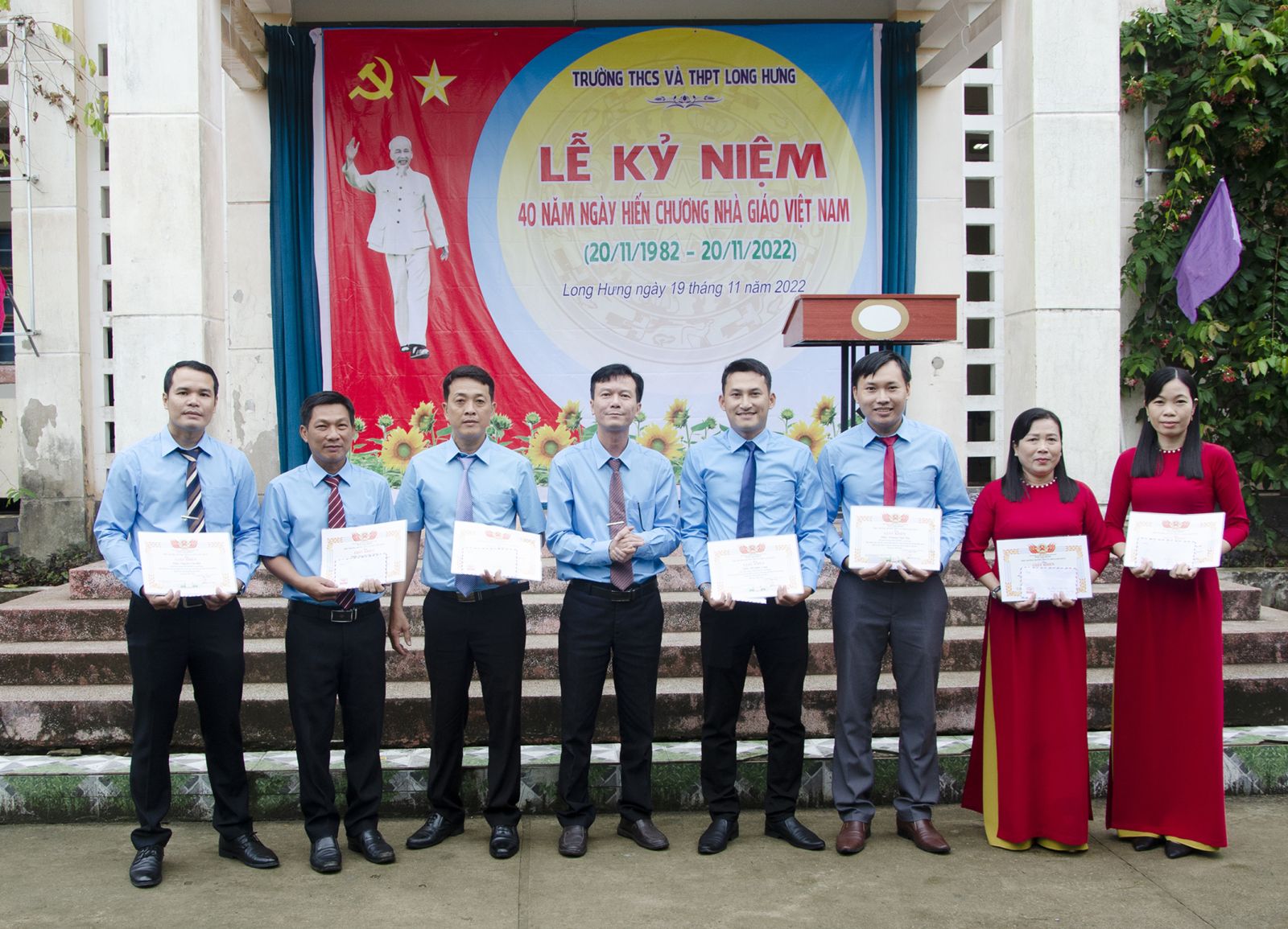 Vào lúc 7 giờ 15, ngày 19/11/2022 (Thứ 7) tại Sân trường THCS và THPT Long Hưng, ấp Mỹ Khánh A tổ chức buổi họp mặt chào mừng kỷ niệm 40 năm ngày Nhà giáo Việt Nam nhằm giáo dục truyền thống “Tôn sư trọng đạo – Uống nước nhớ nguồn” và tôn vinh nghề dạy học. Đồng thời, ôn lại truyền thống tốt đẹp của nhà giáo Việt Nam, những người đã có công trong sự nghiệp giáo dục địa phương cũng như cả nước;
